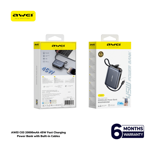 Awei C03 20000mAh Power Bank: 45W Ultra-Fast Charging with Dual Built-in Cables & Digital Display
