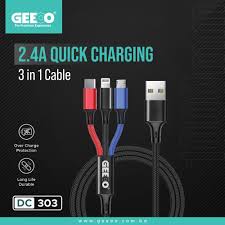 Charge all your devices with one cable using the GEEOO DC-303 2.4A 3-in-1 Super Fast Charging Cable. Designed for convenience, speed, and durability, this multi-charging cable features Micro USB, Type-C, and Lightning connectors, making it ideal for homes, offices, and travel. With 2.4A fast charging support, the GEEOO DC-303 delivers efficient and stable power to your smartphones, power banks, Bluetooth devices, and more. Its high-quality build ensures long-lasting performance, while the tangle-resistant cable design makes everyday use hassle-free. A perfect all-in-one charging solution.